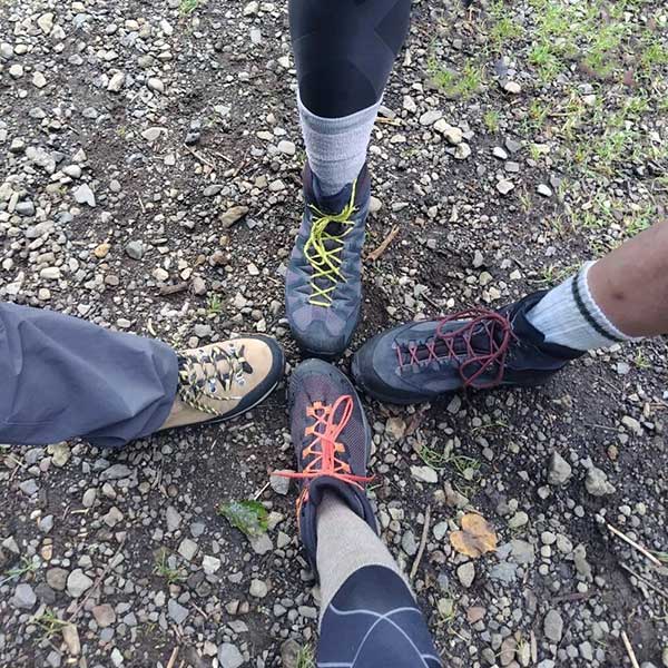 準備を整え、登山口で恒例の儀式。4人の足を十字に寄せ、「無事に帰ってこよう!」と誓い合って一歩を踏み出しました。
