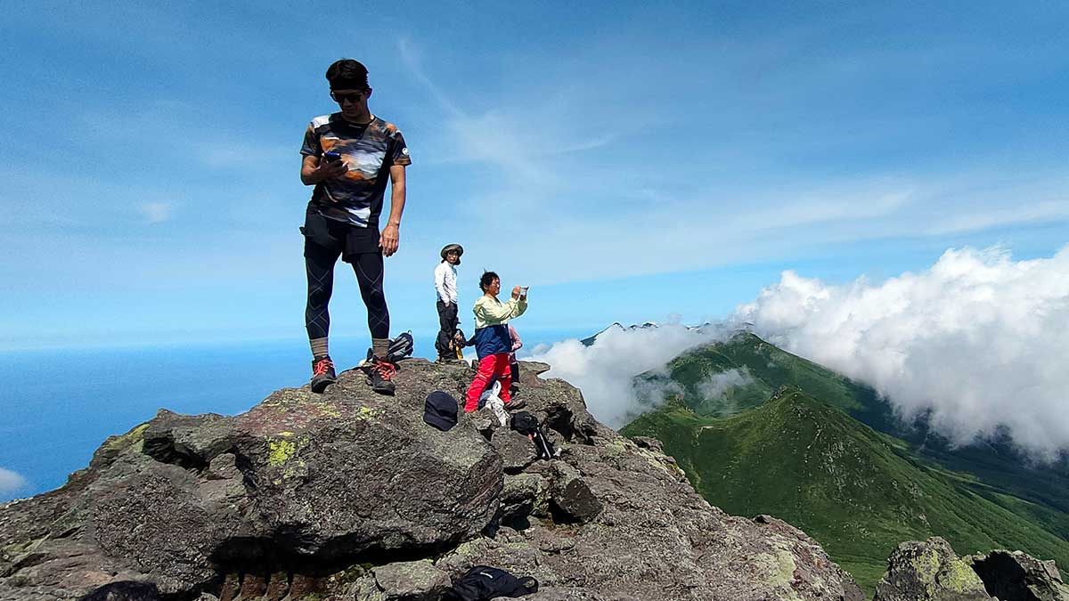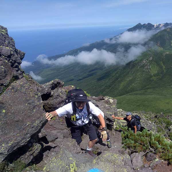 羅臼平から山頂までは、いよいよ本格的な岩登り。大きな岩が積み重なった急斜面を、手も使いながら慎重に登っていきます。落石に注意しながら、一歩一歩高度を稼ぐたびに、背後に広がる知床連山のパノラマがさらに壮大になっていきます。