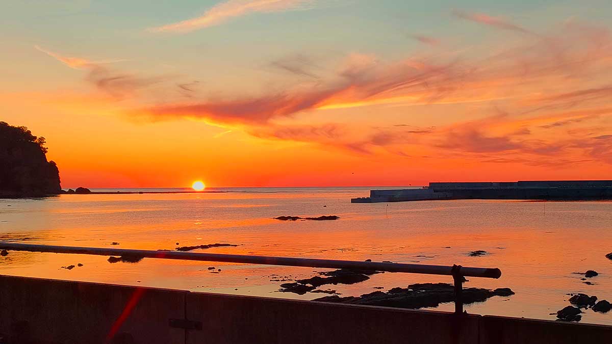 電話で人気店「波飛沫(なみしぶき)」の予約を確認し、宿を出ます。ウトロ漁港に沈む真っ赤な夕日に見惚れながら、海沿いを歩いて店へと向かいました。