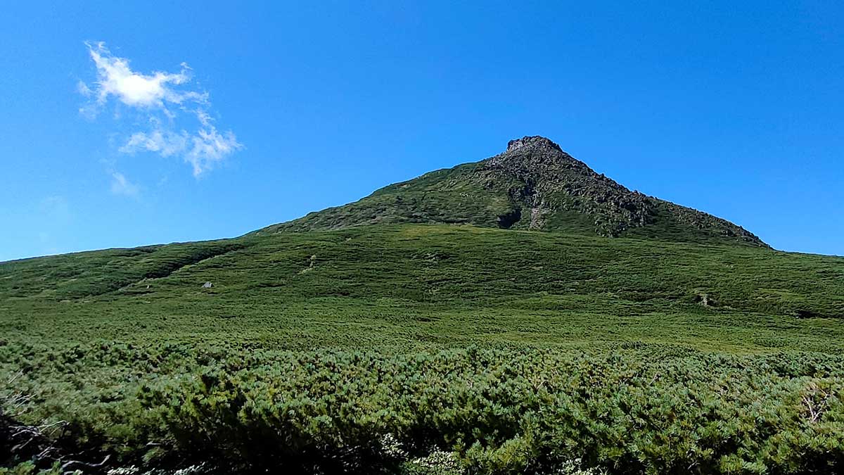 樹林帯を抜け、視界が開けるとそこは「羅臼平」。ここからの羅臼岳の眺めは、まさに圧巻です。天を突くような岩の要塞が、目の前にどっしりと鎮座しています。