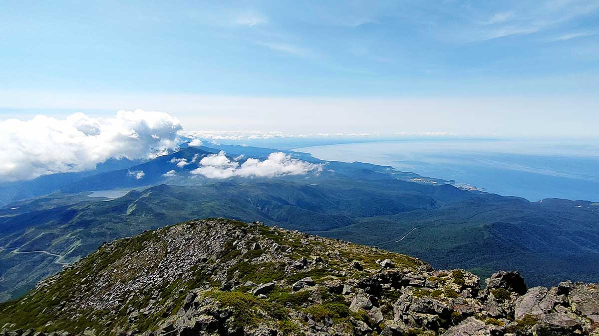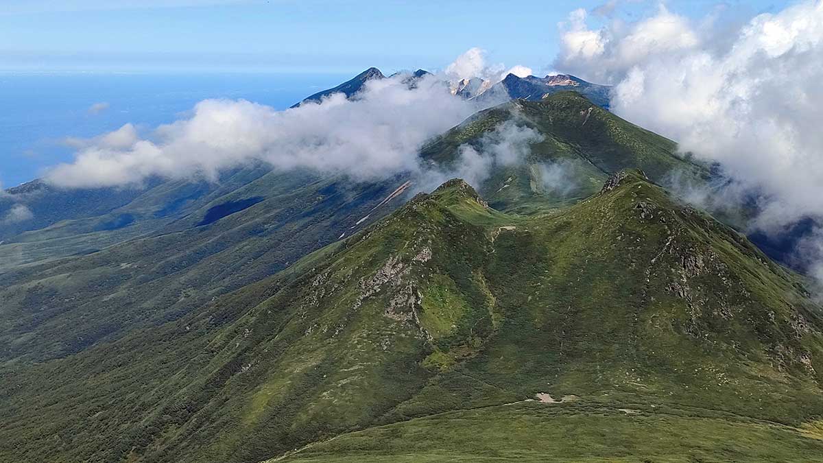 頂上からは、知床半島の険しい稜線が海へと向かって伸びていく様子がはっきりと見えます。
