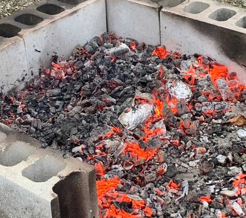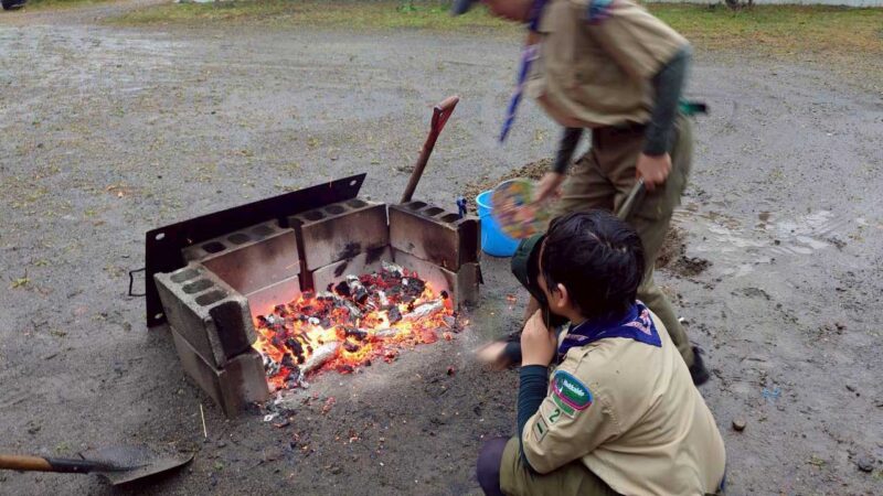 ボーイ隊は集めたサツマイモを焼くために熾きを作る作業を担当。ブロックでかまどを組み立て、燃え盛る熾きを作り出しました。濡れた新聞紙で包んだサツマイモをかまどの熾きの中に入れ、火加減の調整に細心の注意を払います。焼き時間の管理は経験が問われる重要なポイントで、竹串を使って焼け具合を確かめるなど、みんなで協力しながら進めました。