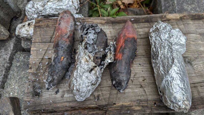 焼き芋を焼くスカウトたちがかまどのそばで火の様子を見守る一方で、ほかのスカウトは畑の片づけに取りかかりました。囲っていた海苔網や単管、竹、手柴などの道具をみんなで力を合わせて片付け、きれいに整えました。作業を終えて戻ると、ちょうどサツマイモが焼きあがっていました。いくつかは少し焦げてしまったものの、全体としては美味しく、ホクホクとした焼き芋をみんなで分け合って味わいました。