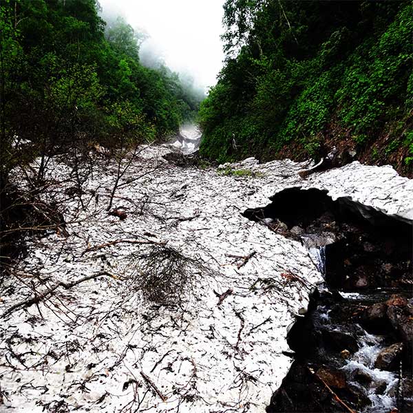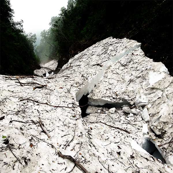 下りで雪渓を踏み抜き2mほど川に転落した。リュックから落ちたことでケガを免れたが、ピッケルが行方不明となり、探すのに苦労した。それ以上に雪渓の上に上がる方法を見つけることが先決で、下流は塞がっていて無理なので、山肌と雪渓の間を登って元に戻った。一歩間違えばここで終わりであったように思え、後悔しきりであった。