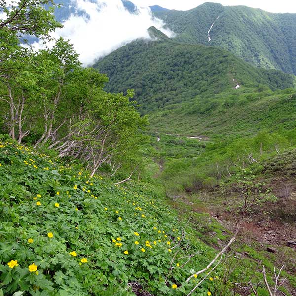 C1550を十ノ沢に入ると北東尾根沿いの踏み後が山頂まで続いていて、沢山の花々が咲き乱れていた。ただし、沢靴では登りづらい。
