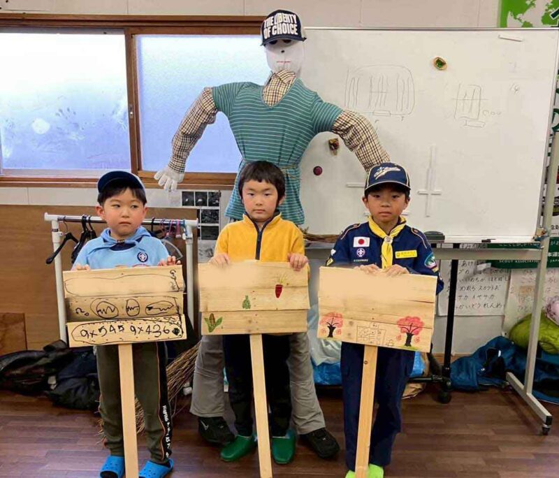 このかかしは、畑を守るだけでなく、スカウトたちの手作りの温かみと努力の象徴でもあり、今後の畑作業へのモチベーションアップにもつながっています。今後もこのような創意工夫を活かした体験活動を通じて、仲間と共に成長していくことを目指しています。