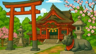 桜舞い散る神社の杜、鈴の音と共に祈りを捧げる瞬間。