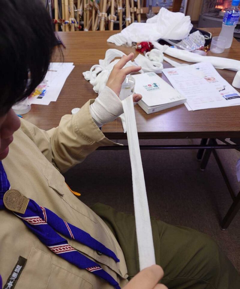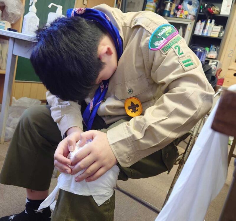 今回のボーイ隊のテーマであるセルフレスキューでは、三角巾を使った自己手当の方法を実践しました。今回は特に、頭部やひざのけがに対しての三角巾の使い方を検証しました。しかし、セルフレスキューは非常に難しく、日頃からの訓練と心構えが何よりも重要であることをスカウトたちに伝えたいと思います。