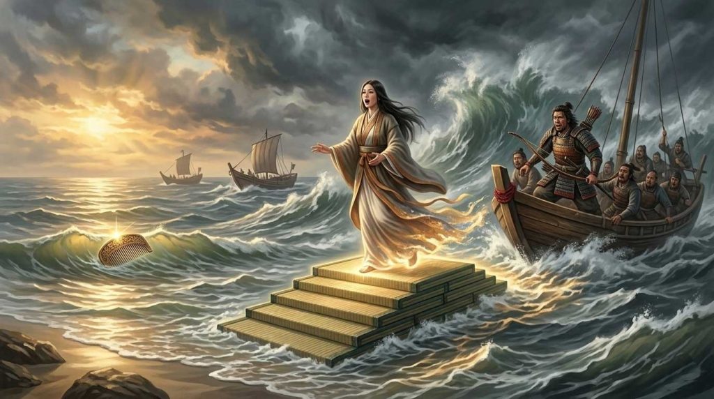 その進軍はまさに神がかっていました。伝説によれば、巨大な魚たちが船を背負って進み、追い風が帆を押し上げ、荒波さえも味方して船団を一気に朝鮮半島の岸辺へと運び上げました。その圧倒的な勢いに、戦う前から戦意を喪失した新羅の国王は「東に神の国があり、聖王が現れた」と恐れおののき、戦わずして降伏を誓います。白旗を掲げた国王は、毎年の貢ぎ物を欠かさないことを約束し、これを見た百済(くだら)・高句麗(こうくり)の両国もまた、ヤマト王権の軍門に降りました。