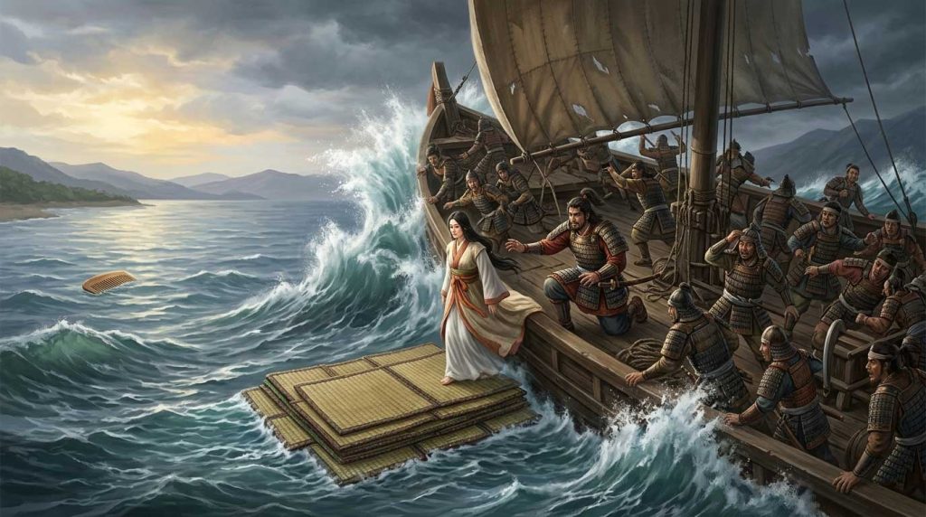 ここで、オトタチバナヒメが自ら犠牲となる決断は、単なる美談を超えた「集団を救うための政治的決断」として読み解けます。荒れ狂う海を鎮めるための入水は、現実には、遠征を継続するために捧げられた「甚大な人的・物的資源の損失」、あるいは混乱する軍の士気を立て直すための強烈な「儀礼的自己犠牲」を指していると考えられます。指導者の失策を、最も身近な同伴者がその命をもって贖うことで、組織の崩壊を食い止めたのです。