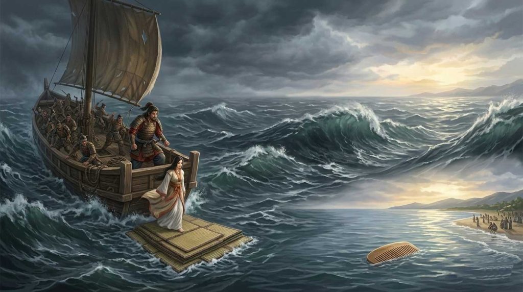 数日後、海岸には彼女の櫛が流れ着きました。タケルはその櫛を拾い上げ、彼女の深い愛と自己犠牲を思い、御陵を造って手厚く葬りました。愛する人を失った悲しみは消えることなく、この出来事が後の「吾妻(あづま)」の嘆きへと繋がっていくのです。