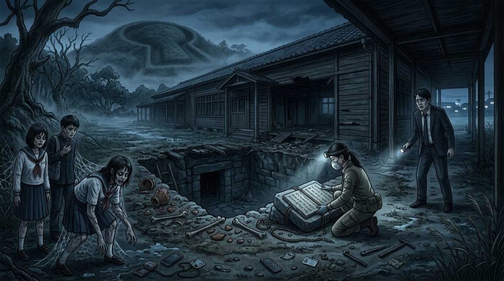 物語は、ある村の中学校で起きた不可解な失踪事件から幕を開けます。夏休みを目前に控えたある日、一人の女子生徒・月島令子と、彼女に想いを寄せる考古学者の稗田礼二郎の教え子たちが、校内にある謎の「古墳」を調査中に姿を消してしまいました。