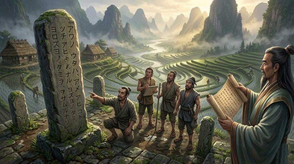 この物語を現実の歴史として読み解くなら、それは「神による天地創造」ではなく、「文字と言葉による文明化のプロセス」の記録です。特に「ヲシテ文字」の存在は、単なる伝承を超え、共通の言語と文字を持つことでバラバラだった部族を一つにまとめた、初期国家形成における情報の統一を象徴しています。