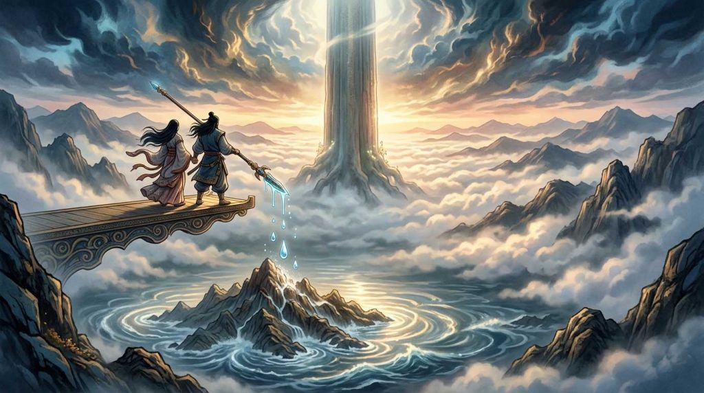 天の神々から「漂っている大地を固め、国を造りなさい」と命じられたイザナギとイザナミの二柱は、天の浮橋に立ち、授かった「天の沼矛(あめのぬぼこ)」を混沌とした海に突き立てました。