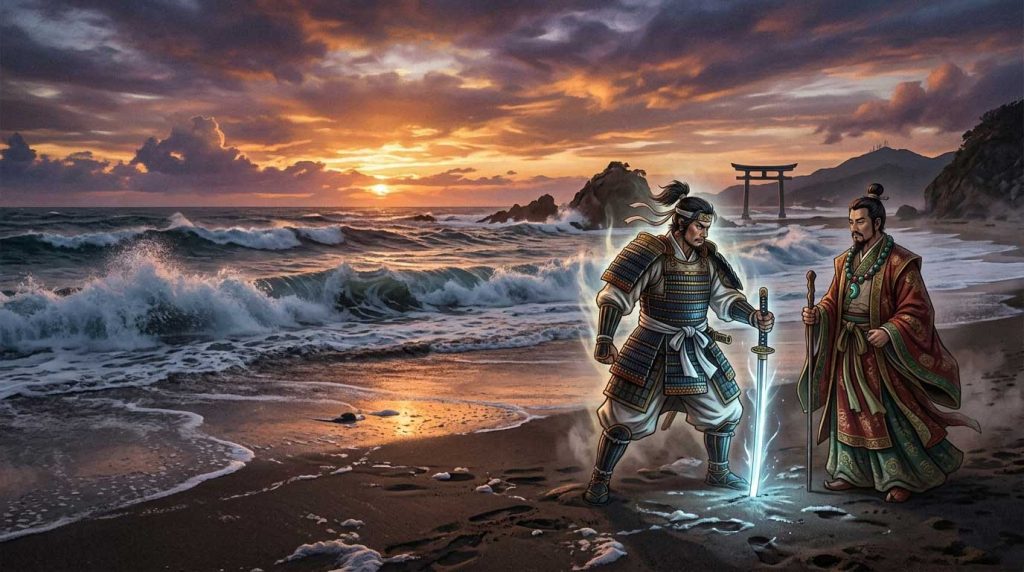 タケミカヅチは出雲の稲佐の浜に降り立つと、十拳剣(とつかのつるぎ)を波の上に逆さまに突き立て、その切っ先にあぐらをかいて座るという圧倒的な威圧感で大国主神に迫ります。「この国を天つ神に捧げるか否か」と。