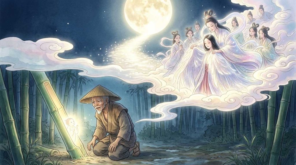 ある日、翁が竹林へ行くと、根元が光り輝く一本の竹を見つけます。不思議に思って近寄ると、中には三寸(約9センチ)ほどの、この世のものとは思えないほど美しい女の子が座っていました。翁は「私の子になるために授かったのだ」と喜び、家に連れ帰って妻と共に大切に育てました。