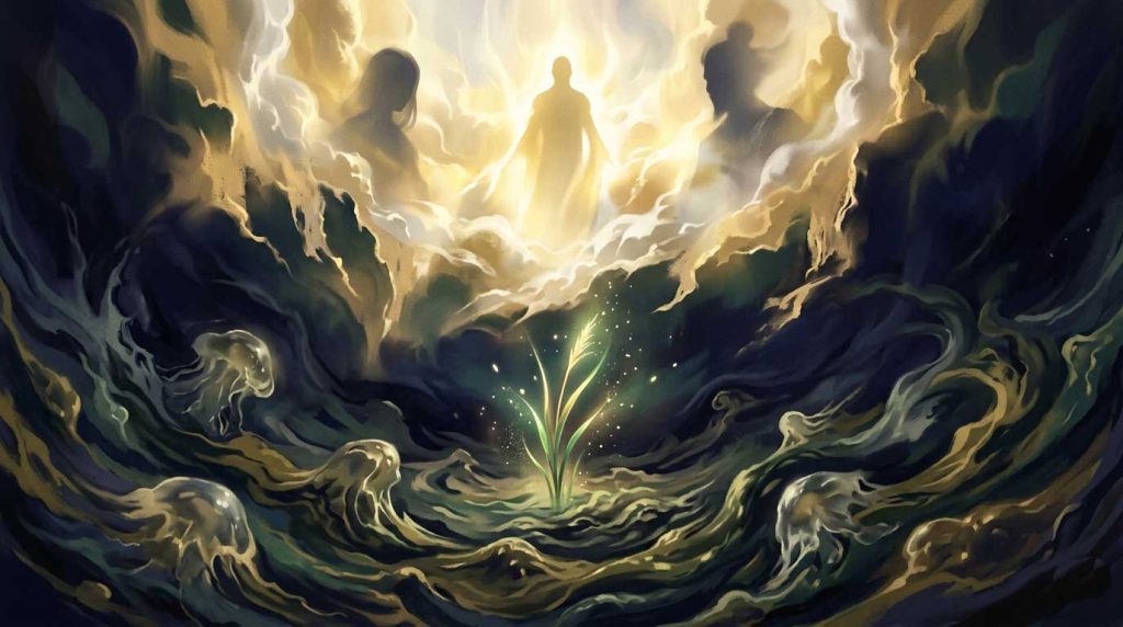 その頃、下界ではまだ大地が若く、泥の中に芽吹く葦の若芽のように力強い生命力をもって、宇摩志阿斯訶備比古遅神(ウマシアシカビヒコヂ)という神が誕生し、さらに天という場所が永遠に揺るぎないものとして確立されたことを象徴する天之常立神(アメノトコタチ)が続きました。これら最初に現れた五柱の神々は、後世の神々とは一線を画す特別な存在として「別天神(ことあまつかみ)」と称されます。彼らは特定の物語のなかで言葉を交わしたり行動したりすることはありませんが、その出現によって、宇宙には中心ができ、生命が生まれる力が備わり、不安定だった大地が形を成すための理が完成したのです。こうして静かに、しかし力強く整えられた世界の舞台は、やがて泥の中から島々を創り出していく伊邪那岐命と伊邪那美命という、次なる世代の神々へと引き継がれていくことになります。