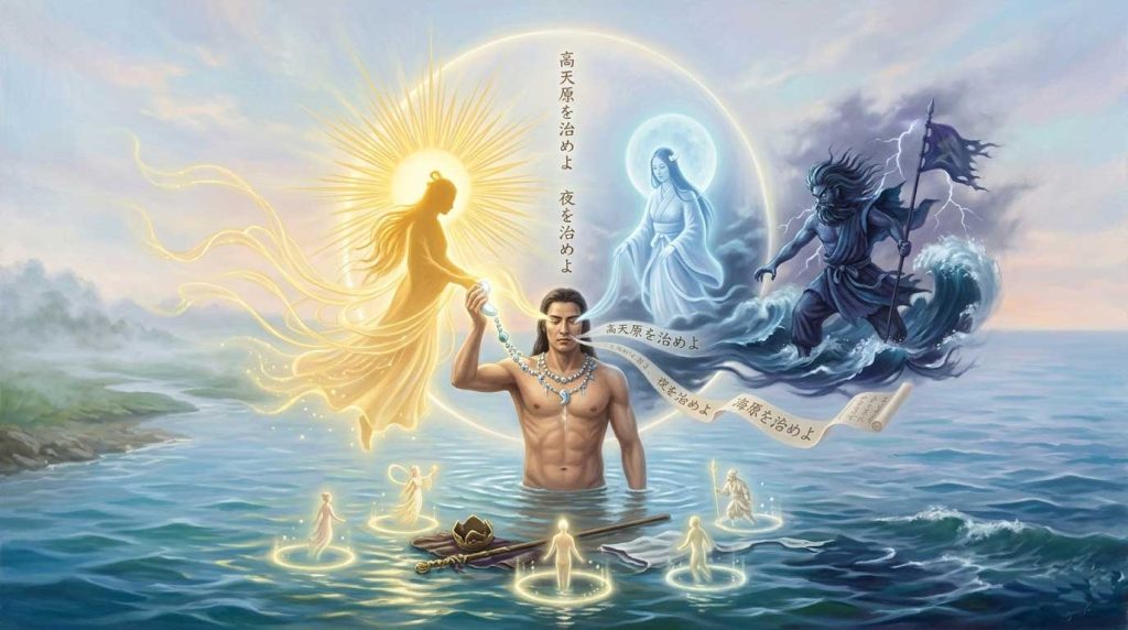 物語の始まりである「禊(みそぎ)」は、単なる清めではありません。それは、旧勢力(黄泉の国)との絶縁と、「新たな統治秩序」の構築に向けた政治的な儀式を意味します。イザナギという絶対的な父権者が、自身の老化や限界を悟り、次世代へ権力を分散・委譲するプロセスそのものなのです。