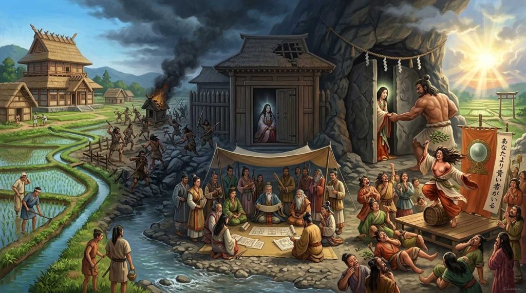 耐えかねた女王(アマテラス)が岩戸に隠れたという事件は、歴史の文脈では「統治機能の完全な停止」あるいは「最高権力者の崩壊」を象徴しています。カリスマを失った国は、暗闇(=無秩序と内乱)に包まれ、指導者不在の危機に直面しました。