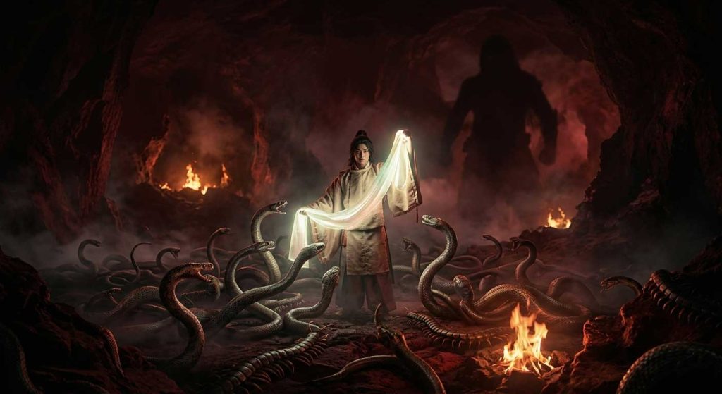 最初の夜、彼は無数の蛇がうごめく「蛇の室(へびのむろ)」に投げ込まれます。窮地に陥ったオオクニヌシでしたが、スセリビメから授かった「蛇の領布(ひれ)」を振るうことで蛇を鎮め、無事に一夜を過ごしました。翌晩には、無数のムカデと蜂が飛び交う「呉公蜂の室(むかでとはちのむろ)」に入れられますが、これも姫から授かった領布で難を逃れます。
