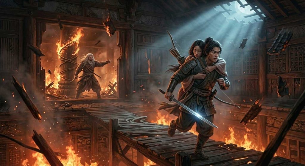 スサノオが深い眠りに落ちた隙に、オオクニヌシはスサノオの髪を部屋の柱に結びつけ、さらには背負いきれないほどの重い岩で戸を塞ぎました。そして、スサノオの宝物である生大刀(いくたち)、生弓矢(いくゆみや)、そして天の沼琴(あめのぬごと)を持ち出し、スセリビメを背負って逃げ出します。