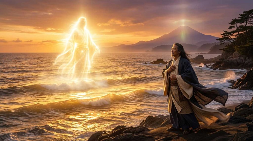スクナビコナが常世の国へと去り、オオクニヌシは深い孤独と不安に包まれていました。「広いこの国を、これから自分一人でどうやって治めていけばよいのか」と、海辺で嘆き悲しんでいた時のことです。