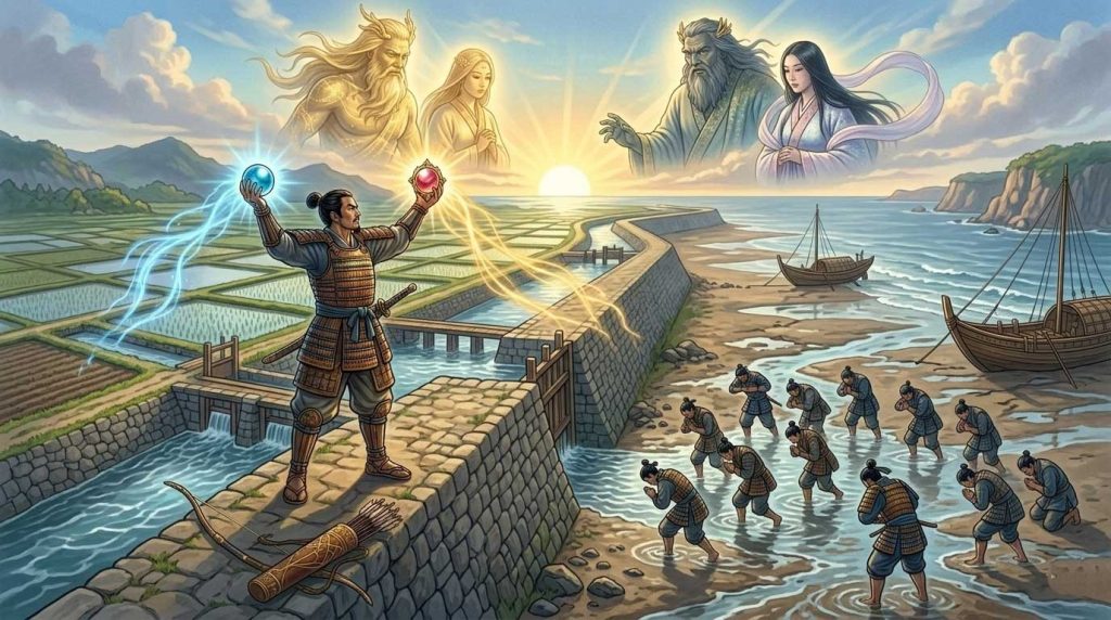 「潮満珠」によって兄を溺れさせる描写は、現実の戦場においては、堤防を築いて川をせき止め、敵陣を一気に沈める「水攻め」や、潮の満ち引きを計算し尽くした「海戦での待ち伏せ」を意味しています。当時の土木技術や気象観測は、現代の核兵器にも匹敵する戦略兵器であり、自然の猛威を意図的に引き起こす力を持つ者は、文字通り神の如き権威を手にしたのです。