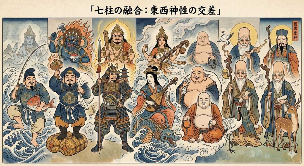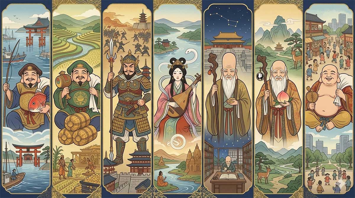 七福神(しちふくじん)は、福徳・長寿・商売繁盛などのご利益をもたらす、日本で親しまれる7柱の神様(恵比寿、大黒天、毘沙門天、弁財天、布袋、福禄寿、寿老人)の総称です。室町時代末期に始まり、日本・インド・中国の神々が融合して生まれた信仰で、江戸時代に広まりました。