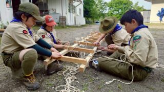 2025年の新緑が鮮やかに映える晴れた日に、ボーイ隊はロープワークを駆使して長い梯子を作る挑戦を行いました。使用したのは3.6メートルの角材が2本と、それに取り付けるために折り畳み鋸で切り出した多数の短い横桟です。これらを組み合わせ、ロープ...