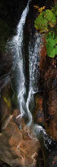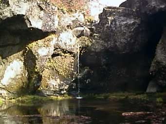 ⑬  左手に洞穴を見ながら、恐る恐る川を遡ると小さな滝がある。途中あちらこちらから湧水が出ている。この滝には大きな滝壺は無いが、小さく深い滝壺が数カ所有るのでよそ見をしながら歩いていると大変危険だ。事実、カメラを持って片足が小さく深い滝壺にはまってしまった。今回は激痛だけで済んだが、一つ間違うと骨折するだろう。十分な注意が必要だ。