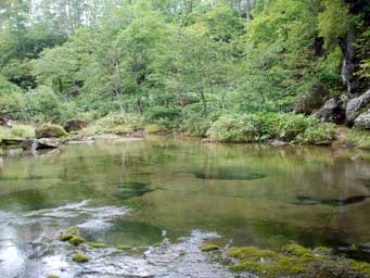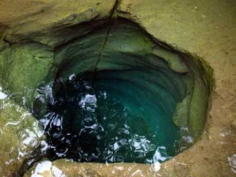 透き通った小さく深い滝壺。直径約50cmで深さが1.5m程ある。