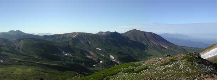 安足間岳からの眺めですが、中岳・白雲岳・松田岳・トムラウシ岳・新井岳・間宮岳・後旭岳・熊ヶ岳・旭岳・十勝連山が連なっています。