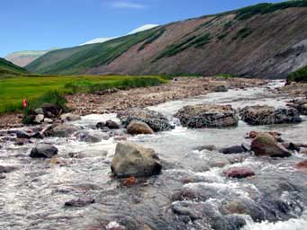 登山道にかかる赤石川ですが、これだけ水量のある川が山の上にあるとは、さすがに大雪山です。この川は、お鉢平の亜硫酸ガス噴出口付近の水が流れてきているために有毒で飲めないことになっているようです。同じ川でも一本手前を流れる北海沢からの水は飲めるようです。飲んだことは有りません。