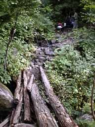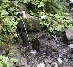 6合目には原木の橋があり、水場には冷たく美味しい水が流れて、ベンチも完備しています。