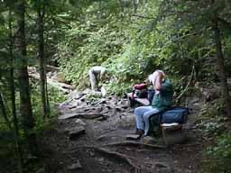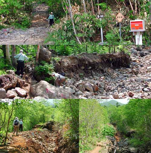 昨年の大雨で、土砂崩れがあり、階段になっていたところが流され、歩きづらくなっています。また、水場の上にも石が流され道がとぎれていますので迷わないようにして下さい。このコースに沢歩きは有りません。