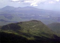 手前の山に見える白い道は、白老側からの登山道と林道です。
