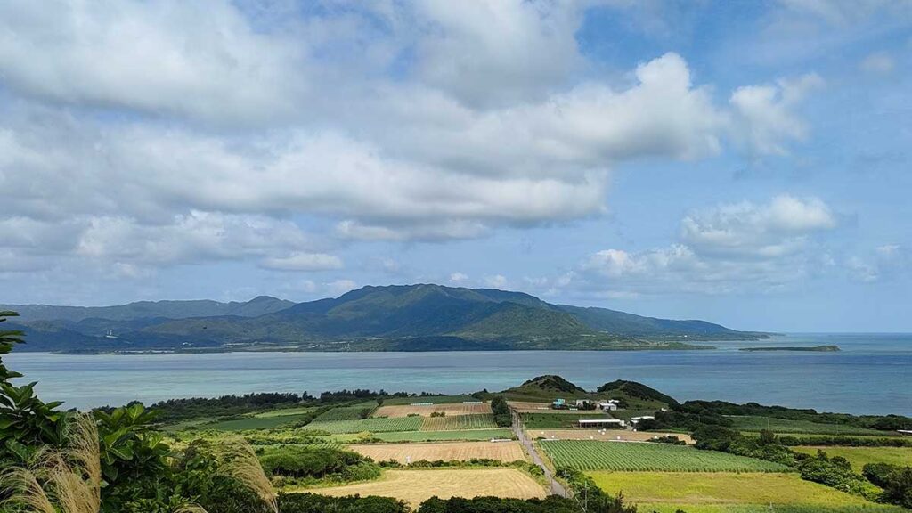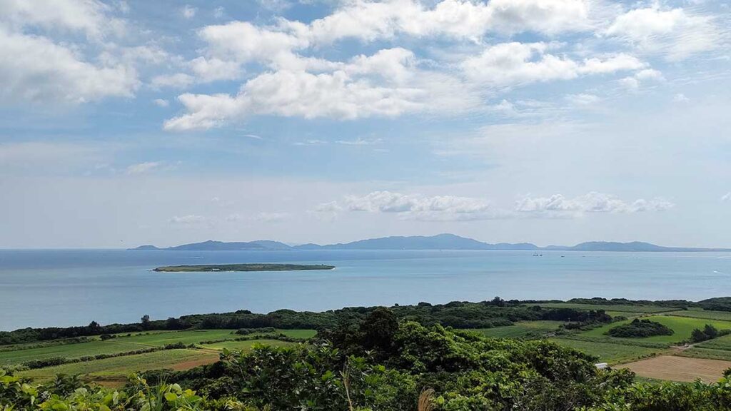 小浜島は八重山諸島の中心にあるため、大岳展望台からは八重山の島々(石垣島、竹富島、黒島、新城島、西表島、ウ離島、由布島、浜島、鳩間島、加屋真島、波照間島)を眺めることが出来ます。写真は、大岳から小浜島の細長く伸びた細崎の先に西表島が見えます。