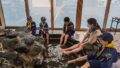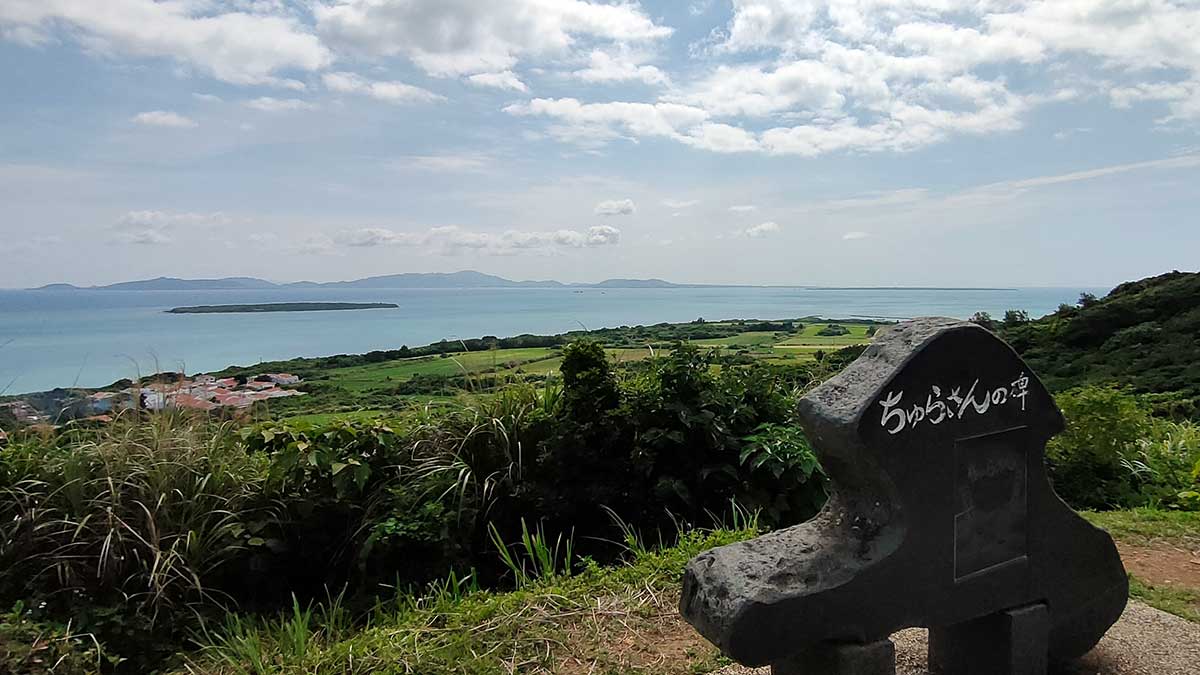こちらの写真は西大岳展望台にある「ちゅらさんの碑」です。見える島は加屋真島で、奥が石垣島です。